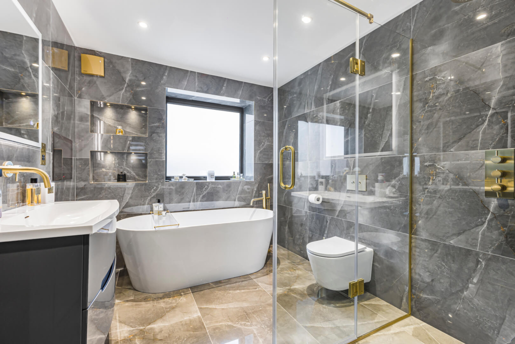 The showers were also installed with rain shower heads that incorporated a waterfall feature. In the main family bathroom we went for a traditional but very understated gold and chrome theme, and a floating gold bath, to compliment the gold fixtures, and marble tiles.