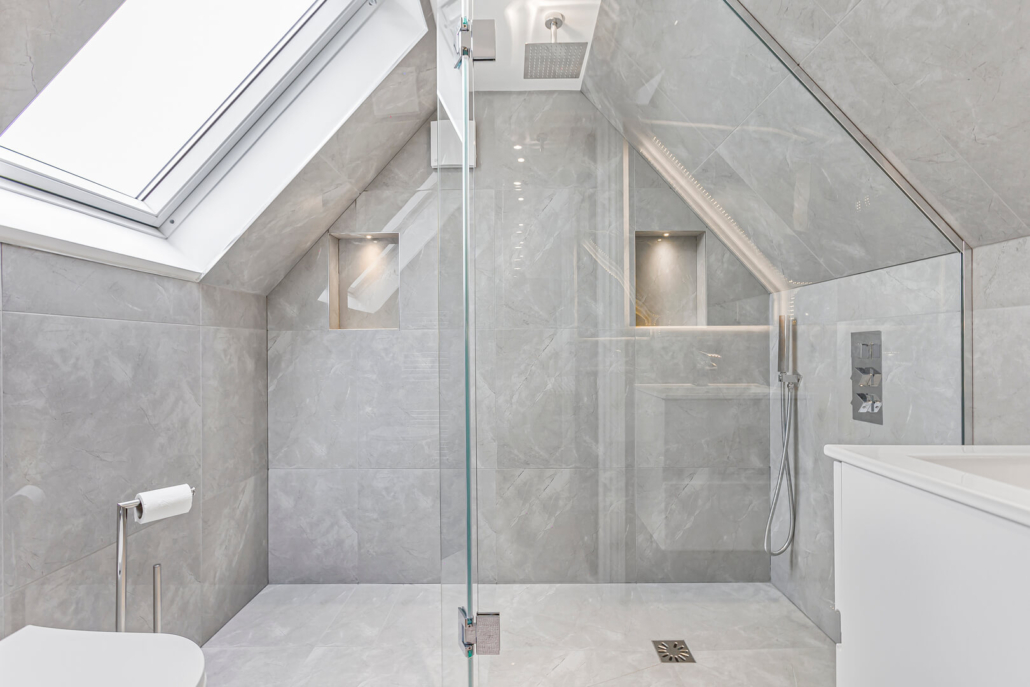 In this property we created 5 separate bathrooms, all in different themes, all bathrooms had installed anthracite shower trays, in stone at floor level, with floating glass screens, as you will see two of the bathrooms have modern hexagonal tiles, in both black and white colour.